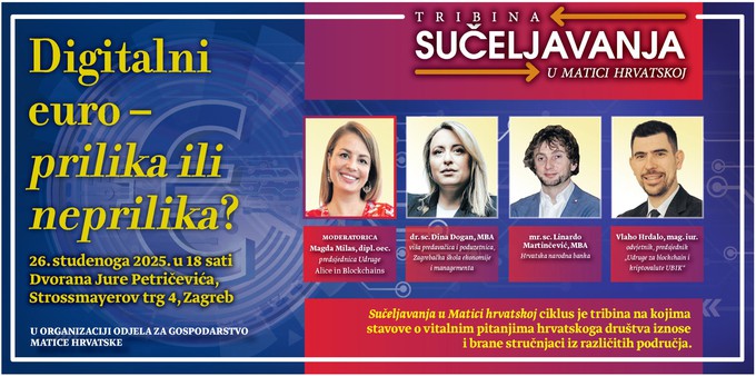 Tema tribine usmjerena je na digitalizaciju novca i aktualne procese uvođenja digitalnog eura kao novog oblika valute Europske unije. Sudionici će raspraviti ključna pitanja povezana s mogućnostima i rizicima koje donosi digitalni euro – od tehnoloških i ekonomskih aspekata do pitanja financijske suverenosti, privatnosti i povjerenja građana u monetarni sustav.