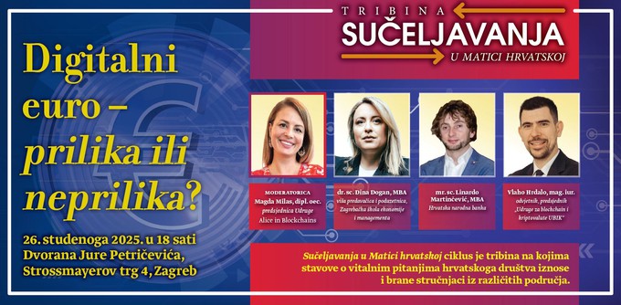 Tribina je otvorena za javnost, a namijenjena je svima koje zanima budućnost novca u digitalnom dobu.