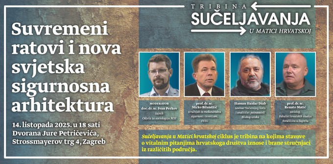 Matica hrvatska poziva vas na tribinu Sučeljavanja u Matici hrvatskoj: "Suvremeni ratovi i nova svjetska sigurnosna arhitektura" koja će biti održana 14. listopada 2025. (utorak) u Dvorani Jure Petričevića (Strossmayerov trg 4).